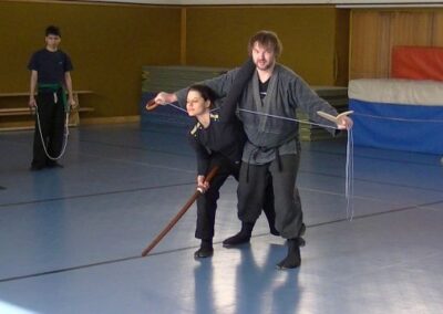 Techniken werden zum Beispiel im Sitzen, im Stehen und mit Hanbo (Halbstock) gleichermaßen ausgeführt.